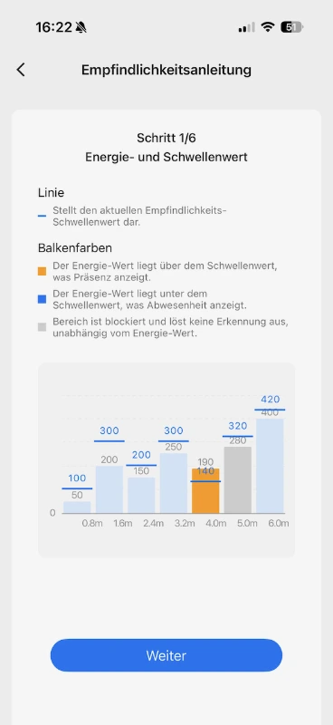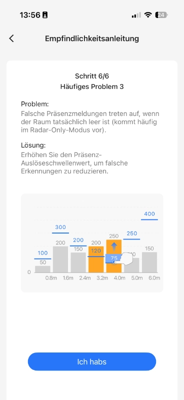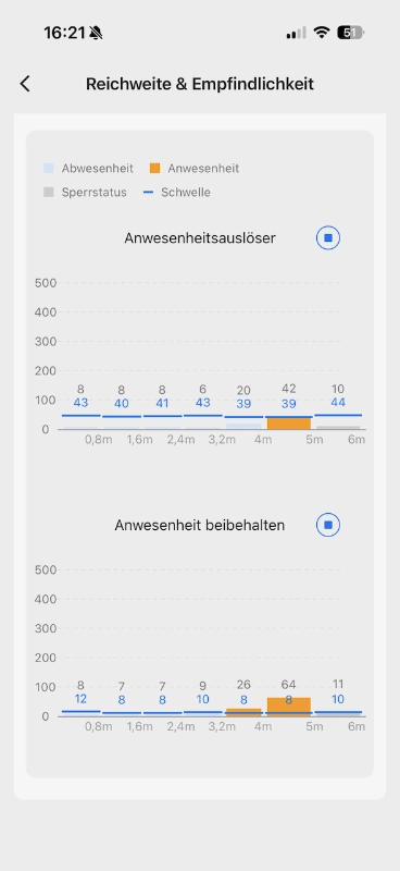 Die Empfindlichkeit lässt sich ca. pro Meter einstellen. Dazu kann die blaue Linie angefasst und verschoben werden. Die grauen Werte oberhalb der blauen Werte geben Orientierung über die aktuelle Signalstärke vs. des eingestellten Schwellwertes. Hierzu benötigt es etwas Zeit und Beobachtung, um den optimalen Bereich zu ermitteln.