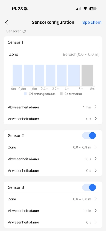 Zusätzlich zur Einstellung der Reichweite und Empfindlichkeit kann mit der Anwesenheits- und Abwesenheitsdauer gearbeitet werden und das pro Zone!