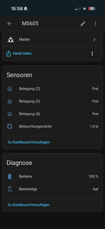 Die Integration per Matter hat auf Anhieb funktioniert. In Home Assistant wird der Sensor als Gerät mit 4 Sensoren dargestellt. Einen Sensor für den Lux Wert und drei weitere Sensoren für die Zonen.
